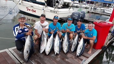 Today the Blue Water Charters team and some friends went out for a team building fishing trip, the plan was to go deep a get a Marlin or for 2nd prize a good tuna. Everything looked right for today and so we decided to go and at 04h50 we left Wilson’s Wharf on Fat Girl and made our way out the harbour and set course for the continental shelf as the SST charts showed warm waters out there as closer in it has been very quiet of late. As we went out we found warm blue water on the inside, but once we crossed the Agulhas the water got colder and greener. In this area we came across a pod of Minke Whales, perhaps 9-10 of them and we came across the remains of what looked like Humboldt Squid, it was here that we discovered that the SST charts were incorrect for the day, none the less we plodded on out to the deep when I noticed a clear line near the drop off in the deep waters and so changed course and headed out towards this line which turned out to be about 1 km wide with a difference of 2 degrees in SST on either side and so I started working this as we found birds, flying fish ( 1 which landed on the bow of the boat, very cute and we put it back in the water), pods of dolphins, some small jumping Bonito and other life in this water. By this time we were this far out we had already spent several hours on the water with no fish and everyone was hungry so we started our braai and got the sausages cooking (Thanks Adam), as we all started to eat I made a comment that when we all have our food in our hands and are in the middle of eating we will get a hook up. As things go it happened exactly like that with a triple hook up with some decent size Yellowfin Tuna and everyone’s hands were full and so with stuffed mouths we managed to land 2 of the 3 with one coming off. We set the spread again and continued working the line and it was not long and we had a full strike with 7 rods going, 1 Tuna came off and one line got rubbed in the entanglement and parted and we landed 5 of them. So after 8 years I realised that today was the first time I had fought a fish from my own fighting chair and it was a decent 30kg Yellowfin Tuna. Of the 7 Tuna landed the smallest was 22kg and the largest was 30kg making the hatch full. 3 of these buss Tuna were taken on the new Rapala Xtreme’s that we have been testing and running. The deck was cleaned and spread reset and I carried on working the line. The story gets an interesting twist at this stage because we noticed a Greater Hammerhead shark ahead of the boat and as we got closer he moved out to the side as we passed him and then he came right into our spread and then the port corner rod gave a short burst ZZZ, we did not want to hook up a Hammerhead Shark and so Erik started reeling in that line, but he was too late and the line went tight, the rod bent and line slowly peeled off the reel, nobody wanted to fight the Hammerhead Shark and Kurt decided he would accept the challenge, he got into the chair and Erik handed him the rod and Kurt stated winding and as he gave the rod the first pump, things changed somewhat and suddenly the reel was screaming and as it went into the backing we saw a Marlin tail walking behind the boat and realised that the Hammerhead fooled us all and we actually had a Marlin on and after a very hard fight we had a Black Marlin estimated at 150kg (330lb) by the boat, the fish was still strong and wiring was quite a challenge and it wasn’t much longer and we had released a Black Marlin. We still had a 4 hour trip to get back to port and had no further action as we headed back in. It was a wonderful day with some fantastic people and some awesome fishing, many thanks to all. Well done and congratulations to Kurt for successfully landing and releasing his first Marlin.