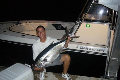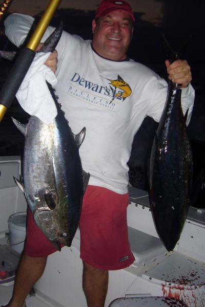 At 7pm we really started the heavy chumming. Throwing net fulls of pilchards every 5 minutes. We quickly hook a sailfish that we ended pulling the hook on and another nice big bonito. Finally we get a bite on the long kite bait. Its him the big blaci fin we have been waiting for Adam makes quick work of him and danny sticks the gaff in the 30lber. We quickly run back to the south and get the baits back out. 2 drifts later we hook another nice blackfin on the 12lb spinner. 25 minutes later we stick the gaff in a nice 35lber. All in all it was a great afternoon of fishing.