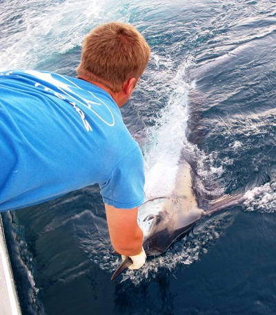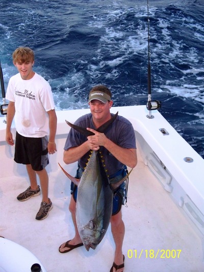 The weather has been a little rough on all of us this spring so far. However, we have managed to get in some fishing and have had some great success. We just recently returned from a long two day offshore trip where Tuna was the main plan. We jigged some Black Fin Tuna on light tackle early the first morning and then we went in the trolling mode. Right off the bat Roland was up with nice Yellow-fin Tuna. From there we worked on offshore a bit and broke off a good fish. Next we actually broke a Sampo swivel in half, never ever seen that before. Then we moved on further offshore and Charlie was on deck patiently waiting his turn and soon enough it was time to go. After a lengthy battle we boat a nice tuna in the 100 pound range. Then very shortly after that we missed a Blue Marlin, or so we thought and it was game on. Mr. Robert (69 years old now) was up and the fight was on. After a two hour battle we managed to safely release the fish with out harm.