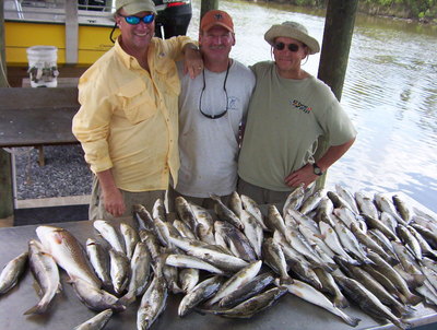 My good friend and Duck hunting buddy Claude, and Barry brought Chuck fishing today Chuck had not fished in 8-10 yrs but it did not take long before he was hauling them in... Man we had an AWESOME TRIP! Great weather and tide coming in. We got on the fish first stop and only moved one time before limiting out on nice speckled trout. Off to the marsh to chase some redfish in the shallows, the guy's put some in the box to top things off and we headed for the dock before it got to hot.