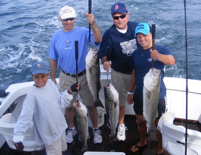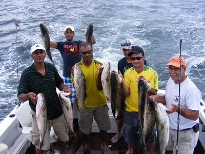 I had two groups out this week that were lots of fun and we did well. Marcos Maranda, from Harwich, brought his crew out for a full day trip. The weather was a little off, cloudy and slightly drizzly at times. The fishing was fantastic. They easily got their limit plus much more. The Brazilian sausage was equally as good as the fishing. The second trip was a booth trip. A father and son and father and daughter. Zack, who's eleven, and has fished out of Rock Harbor before and Meghan, who has experience fishing in the Florida area but never for stripers, loaded the boat. Zack, an old hand at this type of fishing was equaled by Miss Meghan whose experience showed in her ability to handle these majestic fish.