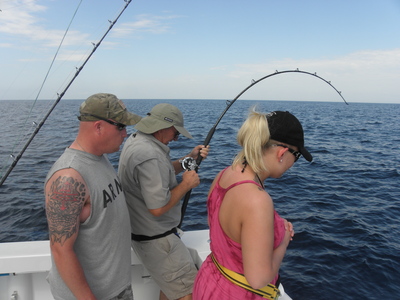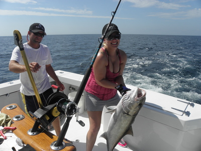 Beautiful sea conditions and a light breeze greeted Mark Smith, his daughter Leah & son inlaw Jamie today as they fished the Mango on the nicest ocean that we have seen in four months. Currents slacked off to allow an easier approach to bottom fishing and a beautuiful color change with a one degree temp break tempted offshore anglers to think that our dolphin bite would begin today. Colder water from a severe winter continues to have taken it's toll; we saw no dolphin but waylaid the amberjacks once again. Memorable battles w/the AJs and excellent company made the day a delight in spite of our dissapointing trolling.