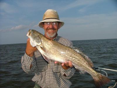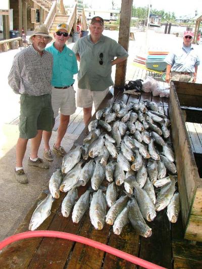 As I have come to expect down here in Venice, it was another great day. Left the dock in DEAD calm winds and arrived at Gorillaville to 2-3 footers. We stuck it out for a few hours only catching about a dozen trout, BUT....they were the RIGHT ones. We had one over 7 pounds and another that would have been WELL over 8 wrap around the trolling motor. As the tide switched we decided to make a move and find some calmer water. Made one stop and finished off 75 trout and headed for the barn. The big trout were caught on the Catch 5 Mirrolure and the "schoolies" were on a combo of live shrimp and plastics under PARADISE POPPERS.