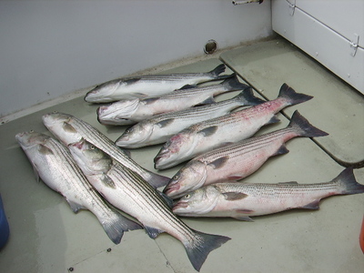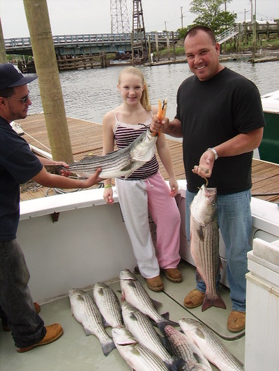 I had Dennis,and Hope Appleby out today for some nice bass Fishing.Hope is only 12 years old and she pulled in her 2 Fishs and her Dads to. Very good job Hope.It was a hard start today the water temp was only 46 in the Bay, till about 10:30am it got up to 51 and then the Bass turn on.We had one short and 9 keepers Capt Carmine