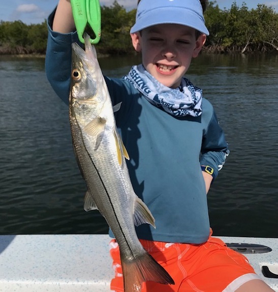Snook are always a welcome catch, here in the saltwater estuary which is a nursery of all the different species of coastal fish we have lots of baby Snook hiding in the cover of Mangrove roots and dock pilings, young Luca from Boston got a nice size linesider with me …………...