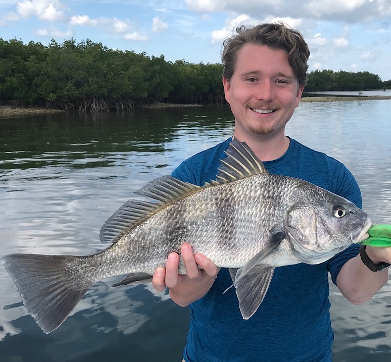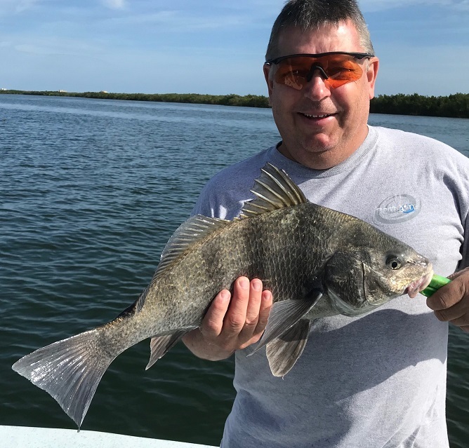 Spring has sprung here in East Central Florida, plenty of 80’ days, but still with cool mornings, our water temperatures have been swinging between the mid 60’s and mid 70’s the last few weeks as we transition away from winter. Schooling baitfish and inshore gamefish is the usual pattern for early spring here, they have spent the winter further south and now swim north following the rising sea temperature. Baitfish as glass minnows, mullet and pilchards, game fish on their tail as Bluefish, Jack Crevalle and Ladyfish. Local resident fish as in Seatrout, Black Drum, Redfish, Snook and others start moving about and looking for food more as the temperatures rise after a winter of chilly water temps as low as the lower 50’s this year. It has been a bit of a pendulum swing through the transition, with warm periods then chilly once again, water temps shifting 10 plus degrees from one week to the next, but as calendar spring arrives now the warm pattern will set in in to stay for the rest of the year till next winter. Black Drum have been one of the more consistent good rod benders, lots of little ones 1 to 2 lbs. up to good back waters size of 5 to 8 lbs. Long time regular client Matt from Ormond Beach Florida caught a few good ones on his recent trip with his dad Dr Ed ……………….