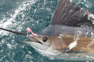 This afternoon, Mike and his two buddies came fishing from California and wanted to land some fresh Dolphin. Once we reached a nice blue edge offshore, the kites went into the air. Within 30 seconds, the deep bait got hit and Mike reeled in a 100 lb Hammerhead Shark. About 10 minutes after our Game Shark, we missed a Mahi. It happens. We placed our trolling gear in the water and watched the rods. There wasn't much action on the troll until I got the bite on my high line. We hooked up with an April Sailfish and it began jumping right in front of our eyes. That was probably one of the last Sailfish we will see until the season kicks off again in the fall. We expertly released the Sailfish back into the blue and ended the day with two Blackfin Tuna for dinner.
