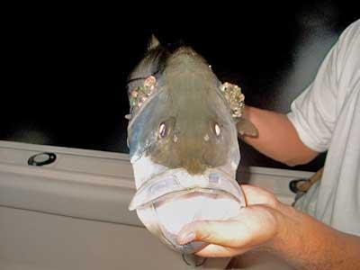 One might speculate whether this anomaly is related to the individual snook's diet, health, water quality, other environmental factors, or the fish having been handled in a particular way. Parasites and fouling organisms are not commonly found on snook, whose protective slime coat not only increases their underwater speed but also helps prevent such organisms from taking hold.