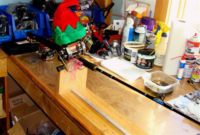I'm consolidating gear by having one set of custom made light tackle mono rods built for handling 12 lb. test line to replace six of the rods I have now. Tom, who does the rod and reel repair at the Goose Hummock (www.goose.com), put them together after we decided what kind of action I was looking for. These rods are truly custom built. Tom and I chose the type of butt, reel seat, for-grips, as well as the guides used. The wrapping's are a simple, black rapping over a royal blue base on a very dark brown Fenwick blank. I wanted a limber tip with some strength in the butt or bottom third of the rod. The rods are designed to handle 10 to 12 lb. test mono with the guides being able to take any braided line I may wish to use in the future.