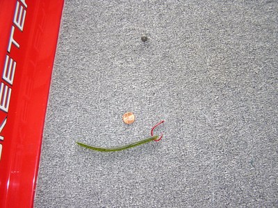 Iuse from 4 to 7 inch plastics with favoritesincluding a5 inchBerkley Wacky Crawlerand a Zoom Fineese (5 inch)in w.m. candy, w.m.red and green pumpkin. I nose-hook the worm with hook exposed. The sinker is on the bottom and the worm is off the bottom about 12 to 18 inches depending length of leader.I have used leaders up to 4 feet in certain situations.