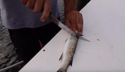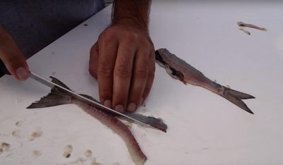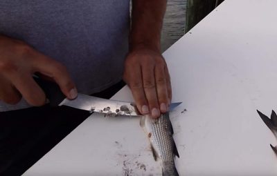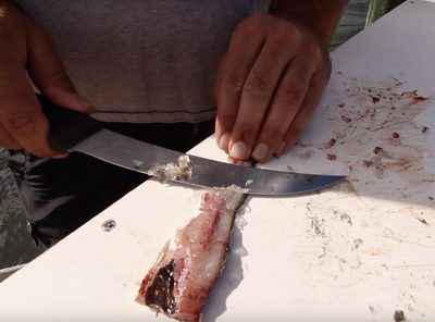 Then, use your knife to make clean boundary cuts down the length of the strip on each side by “rocking” your knife using your hand. This will enable your knife to cleanly cut through the skin and scales. The clean cuts will ensure that you strip does now twist or spin when being trolled behind a planer.