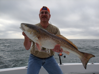 It is October and the first big bull redfish have just appeared along the beaches of Gulf Shores and Orange Beach. Each cold front that arrives pushes bait out of the inland waters and out into the gulf. This means redfish will be in search of this bait near shore. Many people across the country think of a cold front as being horribly cold weather with rain and snow. Well, since we are on the southern gulf coast, the cold fronts will often weaken by the time they reach us. The outcome is often just some nice cooler weather with temps in the 50's and 60's. Why do I like Orange Beach fishing for big bull redfish in the winter? First of all, there are just not many places I know of where you can catch whopping 20 to 35- pound and larger fish, just off the beach. Calm seas usually exist because the typical fall and winter north wind is blocked by land and the row of condos along the beach. This is relaxing and certainly takes the fear away from anyone who has thoughts of sea sickness. We are always just a few minutes from the dock. These giant fish can often be caught on a short trip from 3, 4 or 6 hours.