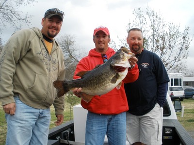 Lake Fork guide James Caldemeyer (center) and clients Shannon Spear (left) and Brian Ketterer (right) saved this 14.68-pound largemouth while fishing on Lake Fork March 7. The fish was 27 inches long and 21.5 inches in girth. It became ShareLunker No. 465.