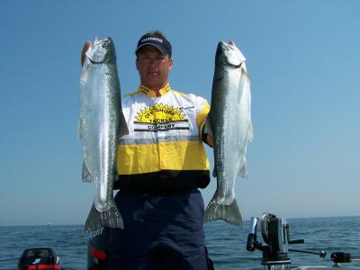 The use of downriggers and dipsey divers is what most use to catch these chrome bullets. Whether you use manual or electric downriggers is a personal choice. I use Walker electric downriggers to make my job as a guide easier. Fishing here is usually done is 40 to 70 feet of water and electric downriggers are not necessary but I do travel to other locations on Lake Ontario and Lake Michigan where fishing can be much deeper.