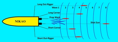This group of lures is designed for high speed trolling and the faster you troll them the better. These lures are all weighted in order to keep them in the water at high speed and any where from 5 knots up to 17 knots, best between 6 knots to 12 knots and for feathers even faster. These lures will perform differently depending on the sea conditions, prevailing winds and the lure type. I love fishing with feathers (My favourite is the Williamson Feathers) and have trolled them even when my boat is on the plane at around 20 knots with extreme success so do not be scared to use them at speed when travelling long distance to and from your destination, they can produce a real unexpected surprise which really helps on a quiet day. These lures have no specific shape or action and so rely on speed to get them working and when pulled at the correct speed will create a smoke trail and you really need to test them out to see how they perform close to the boat. The best position on the wave for this type of lure will be behind the wave so that they have space to ride, placed any where else these lures will jump out of the water and start to tumble. The final positioning has to be done once you are at your desired speed and then you need to maintain that speed. If you change your speed, then you must tune the position of the lures. By doing this you will get optimal performance from your lures and the best chance of catching a fish. You need to sight the lures behind the boat and watch their position regularly and if the conditions change like your wake and lines affected by wind, swell and currents which will influence the performance of your lure. The best positions for these lures are on the long & short out rigger positions and the deadly shot gun position from the diagram. These lures also perform extremely well when rigged in conjunction with a small exciter bird on the long and short out rigger positions. Tip: You can enhance these lures by adding a strip bait to them.