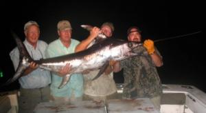 Now its 10:15 and I still have to idle all the way through the jump and get back to the marina to pick and come right back..I ended up changing the skirts on 3 of the baits and soaked the other two in pogey oil and soap..(none would catch a fish so you can rule out deisel as a fish attractant)..got out offshore about 1pm and put out the billfish spread in open bluegreen water..did alot of open water trolling as in the days before and sadly with the same result ...big zero...pulled on a good color change for a while 12 miles out and didnt get one bite..and I had almost given the D-TODD gauarantee too..oh well cant always be right..about 6pm we decided we would try the "hot tuna bite" I had told them about..well guess what..it was cold to luke warm..managed one good yellowfin, pulled the hook on another and boated two small ones (which we use as bait late the next morning) just before we packed up two of the fattest blackfin I have ever seen inhaled as we were picking up..about 30 to dark I gave the order..no more tuna fishing..we headed up on the shelf for a try at swordfish..got set up about 8:45 in 200 fathom line and set about to wait..we would get a double strike 15 minutes later..just as everyone was settling in to sleep..fish number one took the shallow tip rod and as I was setting him fish number two grabbed the deep tip..doubled up..Jack was sure he had a shark and I thought otherwise when I saw both lights up on the surface..two jumps from the larger fish would cancel out the shark idea..Jack fought his sword about 15 minutes while John hauled him aboard for the Balancing Act's first swrodfish catch ever a small keeper by inches..fish number two would prove to be a handfull..took 2 anglers 45 more minutes to bring it to gaff..