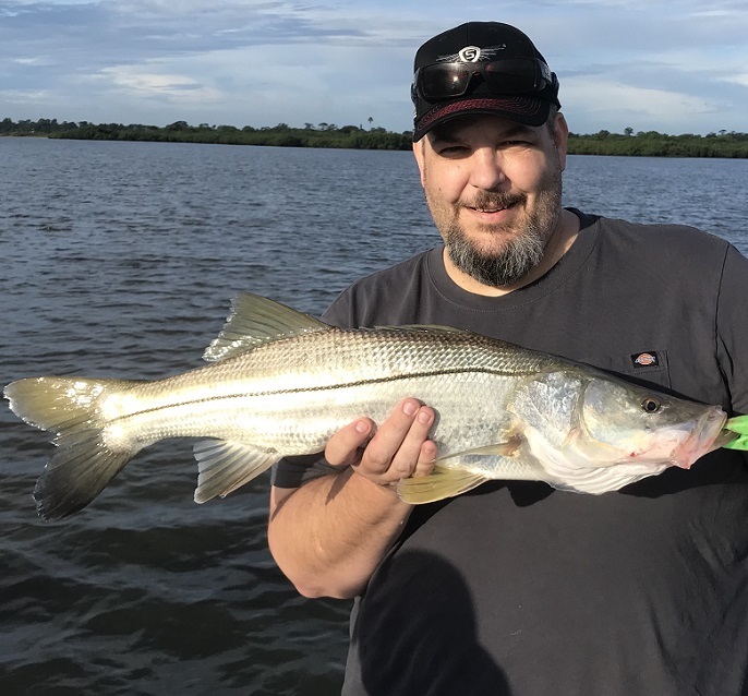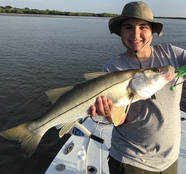 The summer of 2019 is going great with lots of fun fishing trips, we catch lots of different species of fish on my backcountry variety mixed bag trips, the highlight fish are Seatrout, Snook, Black Drum and Redfish, but other good fish we catch more numbers of include Mangrove Snapper, Jack Crevalle, Ladyfish, Whiting, Pompano, and always some surprise catches too, this year some of the unexpected fish we have caught include Permit, Bonefish, Sharks, Scorpion Fish, Mutton Snapper, Horse Eye Jacks, and Cutlass Fish. Summer can have high species variety as some of the more sub tropical Florida species move a little further north during the warm time of year. Long time repeat clients from Georgia out with me recently on a father son trip caught lots of the different fish types top off by a pair of Photo and Release Snook, both on light tackle with big battles, fast work on photos to always get fish back in the water quick especially in summer with warm water and lower oxygen levels, son Lance with a 28” linesider…………