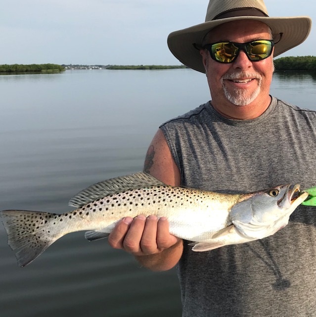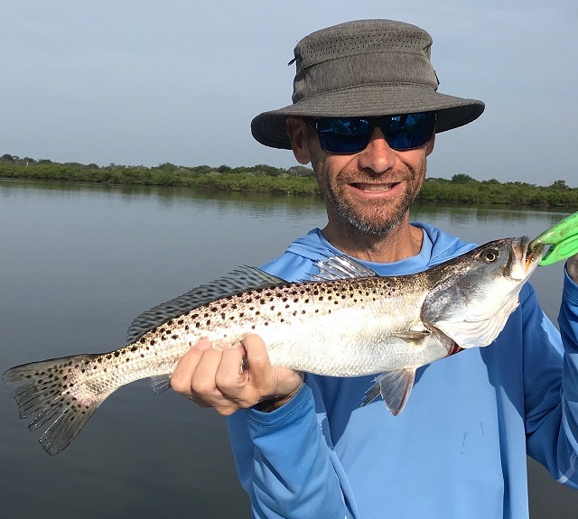 Local Central Florida repeat clients from Mt. Dora came out again on a Seatrout targeting trip with live baitfish, also catching some good size Jack Crevalle and Snapper, Mike with one of his better Speckled Trout …………..