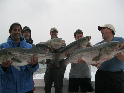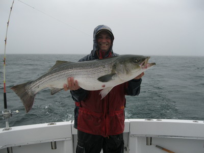Our crew on Sunday decided to roll the dice and give a try. They've been coming out with us for years and they are one of our crews who has gotten lucky and had a great day of fishing every time. Sunday was no exception. Surrounded on either side by tough fishing days, this day started out looking about the same. Dad (a.k.a. Captain Marty) and I made the trip to Barnstable, after hearing that the morning bite had been excellent there recently. Again, it was a gamble, but if the fish were there and they were eating, it would definitely prove to be worth the hour long haul. It took a couple of hours of constantly marking fish, but not catching them (save for a single 27" fish on a jig) before they finally decided our rigs looked tasty. All the while the weather was getting worse and worse. Eventually, the crew had to come out of the salon in the sideways rain to reel in their fish. They would hook up two or three at a time, but often we would only bring one of the lot in. It was no surprise once we got them into the boat to see why they would get away, they were huge! Not a fish under 36" once we switched to rigs.