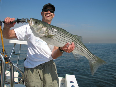 Bright sunshine, flat calm waters with a light wind offered us up a nice catch of Stripers to 34" today on outgoing tide.