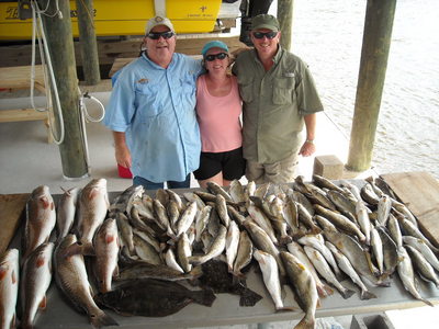 Gene Usner brought along his sister Cindy and his friend Glen for some fishing therapy. Well they got just that but the action was fast and furious. I got Cindy set up first and she was hooked up on the first cast Glen was next and Gene already had one in the boat. The trout were knocking the corks and slamming the live shrimp and minnows and plastics under a cork. I was up and down the boat netting fish like crazy. The bite shut off like a light but the limit was in the box. Off in search of redfish, it was the same as yesterday we had to work for them but got 7 nice reds in the boat along with 2 gorgeous flounder. GREAT DAY ON THE WATER and we made it in just before the rains came down,.