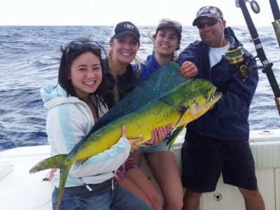 Another spread is out and we missed a 'Cuda bite on the down rod. A few minutes later and Jessica is once again hooked up to another decent Cow Dolphin. The fish fought valiantly but was no match for Jess. Devon put the steel to this nice 15# Cow and sent her to the fish box with her other cousins.