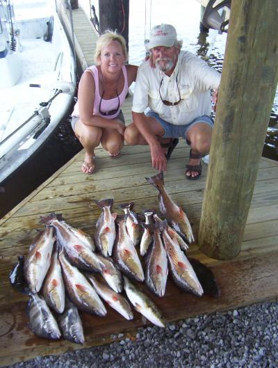 Margie called a few months back and booked surprise trip for Mike they had fished with me before Katrina and had a great time and wanted to do it again. The plan was to had out for some big trout but due to an alarm on the engine we had to stay real close to the dock. Made the best of the situation and focused on redfish in Hopedale lagoon. LSU spinners and gold spoons did the trick. We had to do a lot of trolling but came up with a nice box of fish an Inshore GRAND SLAM. Day turned out great. Mike and Margie had never caught reds this way before so it was something new. Any way we had a blast catching reds in the shallow water and weather was perfect.