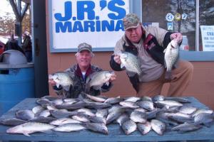 Crappie fishing is Great. The Crappie are in the bays of the upper lake in 6-12 feet of water and suspended 3-6 feet deep. Trolling JIFFY JIGS in 1/32 ounce in the upper lake and 1/16 ounce in the lower lake is producing some of the best fishing I have experienced in years, orange,black,chartreuse and orange,blue, flo yellow are some hot colors right now.