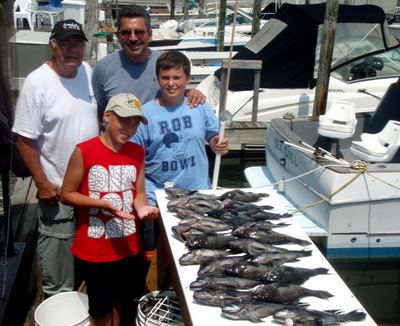 Sal Rosa on the "Miss Beach Haven" reports that they found large numbers of black sea bass last Saturday around the wrecks. There were quite a few throwbacks, but there were also plenty of keepers. On Sunday after the rain they managed a real mixed bag of fish. There were sea bass, triggerfish, croakers, and blackfish to take home. Recent pool winners were Scotty Tohotty of Beach Haven with a real nice sea bass and John Cheeseman with a blackfish.