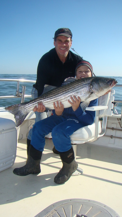 First young Eric picked up a big bluefish in about 35-feet of water. After more time trolling, a big fish hit. Young Eric grabbed the rod and fought the fish for 25 minutes until a 40-inch bass was boated. These were Eric's first big fish every, and he surely is a hooked angler now.