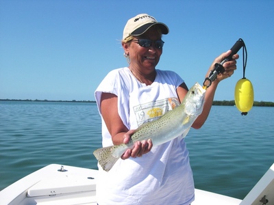 The beach only had several boats fishing, a hide tide ready to flush out of Tampa Bay and light breezes. What could be better. We made several moves with only a few hits to show for our efforts so far. Maureen hooked a strong fish making numerous strong runs. Maureen skillfully landed a 4' Bonnet Head shark. Another Captain friend caught a beautiful snook that was 36" right next to us. We moved back inside from the beach and immediately got on the trout bite. For short periods of time the trout were very active chasing baits all over the flats.