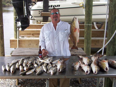 Al Godwin from Shreveport La called to see if I was up for trip Monday after all these storms I was ready. We headed out around 7:30 first stop 4 nice trout then zip. Second stop the trout were biting good on live shrimp and Old bayside plastic Shrimp under corks. But the needle fish were all over the live stuff so we eventually switched over to plastic. The bite was not as fast but no needles to deal with. Off to our next stop put a few more in the box LOOKING GOOD. Fourth stop was sliding into home plate the redfish were in frenzy we had 10 in the box in 30 minutes and played catch and release for awhile. Moved to few more points picking off some trout and catching and releasing more reds. FANTASTIC DAY!
