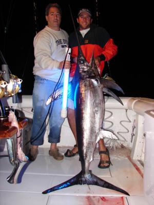 Last night we did a crew trip on the Liquid Gold in prep for the next 5 nights which we have booked for sword trips. Whatever little wind there was inshore certainly didn't carry offshore and we were greeted with very nice conditions. Like the last time we were out, it didn't take very long and around 8pm we hooked the first fish that hit a squid at 125' on a balloon. Morrie hooked up the harness and give it hell and had a frisky 60" fish next to the boat in a matter of minutes. However the fish had other plans and ripped off a series of jumps and then another 100yds off the reel. 15 minutes later Capt. Jason Neadel sunk the gaff and we had a nice 60" fish in the boat. We cleaned up and packed the fish out on ice and headed home early satisfied with the amount of meat we had! Hope to have some more good reports for everyone as we should be on the water every day into next week!