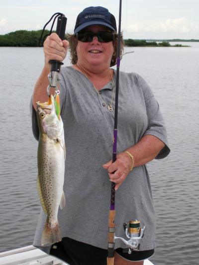 Later on in the week I had the pleasure of fishing with my long time clients Jay and Nancy Allen. During the three beautiful days we fished together we landed over 70 Redfish (most of which were keepers) and 30 trout. During one of our days we fished with a beautiful south wind and a light drizzle. A low pressure system was leaving our area and the drizzle was a welcome sight. With the rapid fluctuation in the barometer the fishing really began to heat up. The first spot we stopped at was a small island way inside an area we call the Salt River. "First Cast" Nancy's first cast landed in a perfect spot where a huge school of mullet was milling around. It didn't take long for a feisty redfish to show itself and the fight was on. Nancy did an excellent job of pulling the 25" redfish away from the school of mullet to keep from spooking the rest of the fish that were hiding in the school. Our next three cast we made into the large school of mullet all produced the same results, "Slot size Reds." For the next 4 hours we trolling motored around the island following the school of mullet and caught redfish after redfish. Total we ended up with 15-20 ranging from 16-28 inches. What a way to start the day.