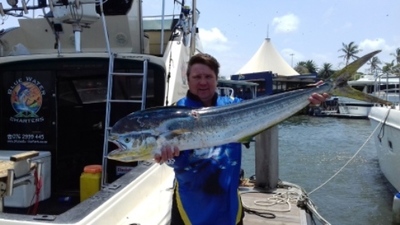 With an early launch we made our way out deep and headed south, we found warm, clear purple water just under 26deg.C. Birds diving and hovering, flying fish, bait schools and lots of small tuna jumping everywhere; we were excited and were expecting something big. Before 06h00 we had a nice size Dorado landed and in the hatch. The forecast had shown that in the afternoon a strong SW wind of about 21 knots was coming, but it hit us out in the deep at about 07h00 at close to 30 knots and the sea got big so we decided to turn and run back with it to shallow waters which would be smaller and so we headed towards Umdloti but sadly the waters here were green and void of life by 11h00 we were close in and spent the rest of our trip fishing for mackerel on light tackle.