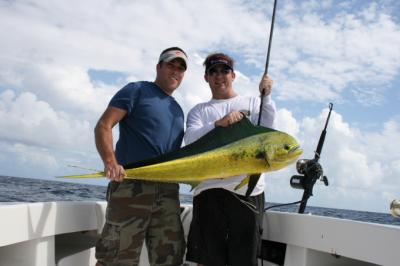 As the week progressed, we got a little bit of NE wind. With the NE wind we also had some North Current and blue water. With these conditions we were able to find both sailfish and decent size dolphin on the edge. Using pilchards, herring and goggle eyes, we baited the kites and flatlines. The largest dolphin we caught was a 24 pound cow, which was part of a double header. The second dolphin (bull dolphin) was easily in the 35 pound class, but unfortunately the hooked pulled after 10 minutes or so. By the way, I got a new digital SLR camera and should have some real good photos coming up. The photos I have on the web are shrunk in file size to allow for faster uploading, but I do have the Hi Res originals of all the pics. Check out the new picture of the sailfish jumping and the colorful dolphin on the photo page.