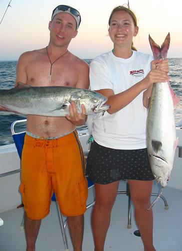 We headed back out on the 8 hour for an afternoon of "R & R" with some friends visiting from Florida. We headed up to the Path for some bluefish action. We picked up some big fish trolling hoochies. We found a dragger South of the Shoals and caught a few nice bass clamming in the dredge wake, before we anchored up for some swimming.