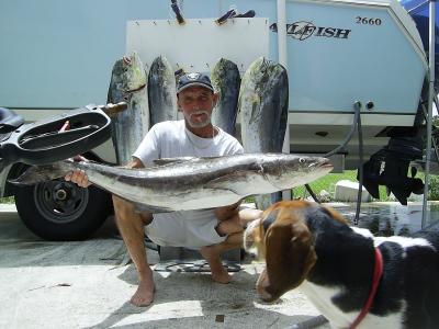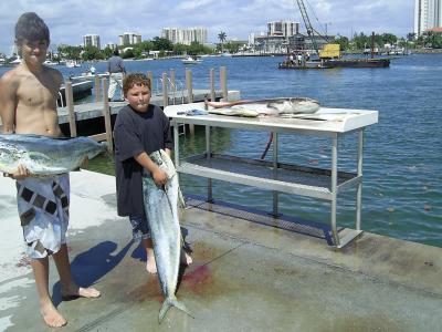 AFTER RIGGING UP SOME TROLLING BAIT'S I STARTED OUT AS SOON AS I CROSED OVER THE 200'LINE THE DOLPHIN HIT BOTH OUTRIGGER'S THAT WELL WAKE YOU UP LEON GOT A NICE 22LBER COW JIMMY GOT A 24LBER.