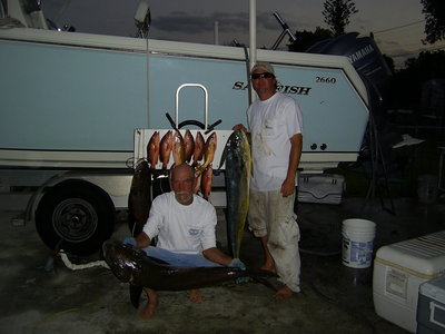 I'VE BEEN TAKING TONY MY FIRST MATE ON SOME FUN TRIP'S I SHOWED HIM WHAT A BIG COBIA LOOK'S LIKE UPCLOSE WE WERE ANCORED UP IN A NICE HOLE I'VE GOT JUST FOR THE COBIA'S AND SNAPPER IN 123'OF WATER ON THIS PAST MONDAY. WE HAD THE TAIL'S GOING ABOUT 10 IN THE COOLER THE RUNNER'S WERE SOLID FROM TOP TO BOTTOM WE HAD ALLREADY LOST 2 30+LBER COBIA'S BECAUSE TONY WONT US A LEADER LONGER THEN 2 OR 3'AND THY RAPPED AROUND THE MOTORS JUST AS I WAS FEEDING A 6' CUDA A 6' COBIA CAME IN FROM UNDER A GIANT RAY TO SEE WHAT WAS GOING ON AND I WAS NOT READY FOR HIM AND OFF HE WENT TO SAY WITH HIS RIDE.TO MADD TO TAKE PICTURE'S. HERE SOME FROM THE LAST COBIA RUN