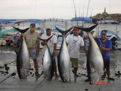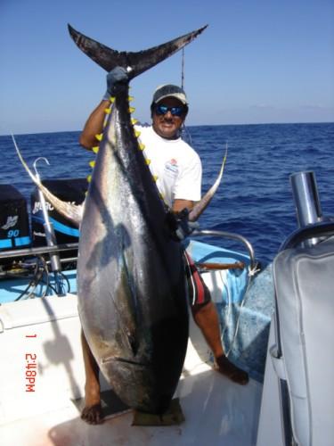 Big cow yellowfin are beginning to move in with massive pushing massive schools of baitfish . we're catching 200 lbs class cows with bigger ones probably coming in right behind them . We're hooking up with some big black marlin as well in the 400 - 900 lbs range . Yesterday we had a double header on the blacks , releasing the bigger one and unable to revive the smaller one ( 785 lbs ) . It's on in punta mita and we hope to see you this season for some insane fishing action.