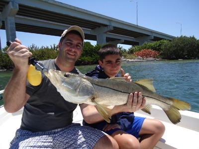 Next up we targeted Tampa Bays snook. Working sady potholes in 2' of water we found juvenile snook to 22' eager to slam our live baits. Mixed in were trout to 20". Our chum baits brought in a school of jacks that made for non stop action for 20 minutes. The fun really began when Anthonys rod doubled over and 50 yards of lined peeled of his Quantum Cabo reel in seconds! Momenets later a big snook exploed on the surface. Anthony fought the snook for 10 minutes going completely around the boat!Anthonys first snook measured 34".