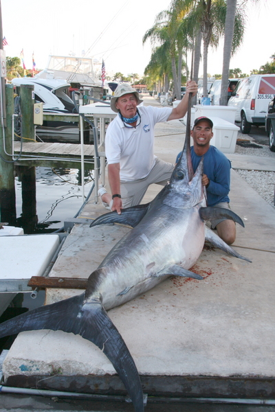 Although it still has been a bit windy, we have had a few days where the weather cooperated and we went daytime swordfishing. Both of our trips we caught swordfish and one of them produced a real monster of the deep. That fish was caught by 3 guys from London that came to the US to fish in the Keys for a week or so and then to Miami to try the new daytime broadbill fishing. On our first drop we didn't get a bite, but the second drop we caught a 60 pound swordfish that was caught by David West. This was his first broadbill and was plenty excited about the catch. Although way above the legal size, we all agreed to release it to grow bigger and fight another day. Our next few drops did not produce any bites and reports from the radio were the same. Out of the fleet there were only two fish caught and luckily one was ours. I picked up and ran farther south and decided I would spend the rest of the day there. On our first drop, I marked a swordfish on the bottom with my new Simrad depth recorder. Some may be skeptical about that, but this is at least the 5th time I have marked a fish on the bottom and caught it. All I have to say is that the new CHIRP technology is very impressive. Once I saw the mark and it was a fairly large mark, we dropped the bait back to the bottom and within a minute we were getting bit, but no hookup. I thought the fish lost interest, but a minute or so later the rod started to load up and the fish was on. Clive was now on the rod and the fish fought pretty hard on the bottom, but eventually started to rise. Usually fish over 200 pounds can swim the lead up and the rod tip basically goes slack. The smaller fish aren't as strong and can't lift the lead so they end up fighting the whole way. This fish did a little of both so in my mind I thought we had a 150 to 200 pound fish on. Once we got the lead off the line the fish surfaced showing us her dorsal fin first followed by her tail fin. There was a good separation between the fins and I knew we had a very big fish on. She stood there for what seemed like an eternity with both fins completely out of the water. From my experience only the truly big girls do that. She then charged the boat. We had a shot with the dart but missed and then she tried to dive under the boat and into the props. I put the boat in reverse and spun away from here and got her off to my bow where she proceeded to jump completely in the air. What a sight!