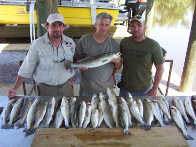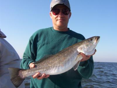 Steven, Garret , and Steve were waiting for me when I got to the boat. I was a little late but had the well full of croakers. We headed to the rigs in the sound to see if the big trout were hungry. It was a little bouncy but worth the ride. First cast Steven nails a big 5 lb trout, first fish of the day a trophy trout. The bite was slow but when you hooked up it was a big trout all net fish today. No limits but we had the Quality trout not the numbers. A few fell to plastic but croakers on the bottom was the way to go.