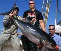 Lots of action on the surface this weekend..jhad a crew of marines in the Ledbetter/Pearson party.. We saw alot of fish blowing up but couldnt set up on them..bait and birds all over the green water on the shelf but so are the sharks..made a quick stop in familiar territory on Friday and were eaten alive by sharks..I think they were following the humm of the engines because we couldnt shake them..lost 4 baits and 2 jigs before bailing..bluewater moved out about 5-10 miles from earlier in the week..took a while to get in the rhythm but when we connected the first fish of the day was a stud..fought it for 20 minutes when expecting a 60 pound fish we werent prepared for the 150 pound fish that swam right to the boat and stuck its chin up for the gaff..I wasnt running a deckhand at customers request..so when my biggest guy hit the fish perfectly in the head with my favorite gaff - guess what happened..lost my favorite "Rod Shop of OBx" gaff..we would spend another 55 minutes chasing it down until the death spirals brouhgt in to the surface again and ending with two of us dragging it through the door..its been a while before we have had a fish to be nervous over but we were rewarded for our patience in the end..great weather too..managed another 3 smaller fish but none of the same caliber..Capt Scott Leger had 4 yellows as well, he was fishing right next to us..and all his action it would seem took place while we were fooling with the big boy..