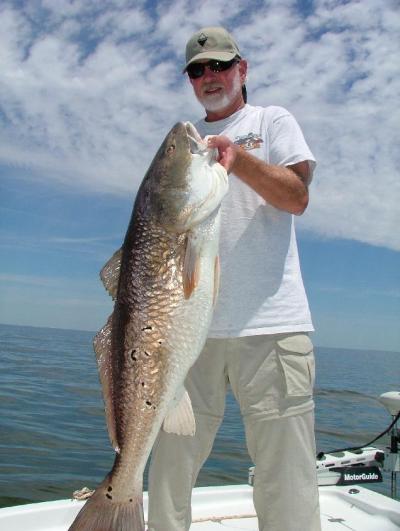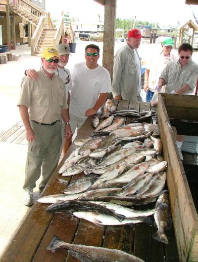 We actually made about 6 stops without even seeing a trout. As I was pulling up to my next and last spot, I told the guys this was it. If they are anywhere this is the spot. And they were there! Nothing to put on the wall, but in the next hour we boated 30 trout in the 3-5 pound range. We also caught a Red that was 40 pounds. A REAL 40 pounder, not one of these 20 pounders that somebody says, YEAH THAT THING MUST BE 40 POUNDS". This fish was THICK! Ended the day with around 60 fine trout, a limit of reds and a bunch of bulls released.