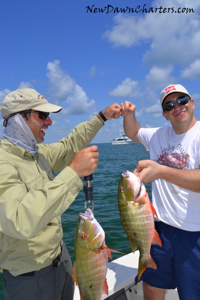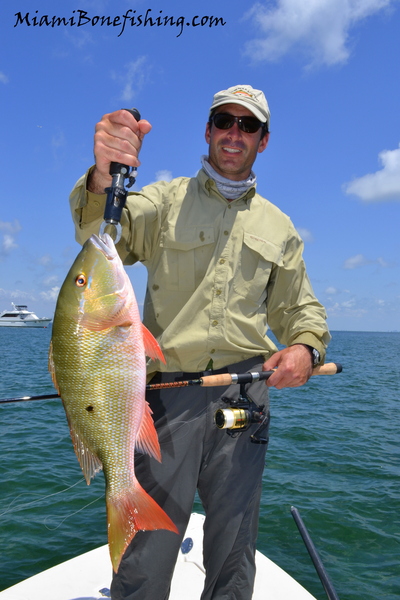 This Sunday found Dave, a trout guide from Wyoming www.JacksonHoleAnglers.com and his long time friend, Ken, from Pennsylvannia on the bow of my skiff for a half day break from exploring Miami. The plan was to mix it up in Biscayne Bay. We started with some shots at tarpon on the Oceanside including a string of 100lbers in 3' of water, always an impressive sight! We then switched to bonefish and some shots later our half day was running out. We had two choices, run far north to what promised to be fast bonefish action or take a short hop to mutton land. They decided upon mutton land, and as usual the muttons didn't disappoint. Minutes after arriving, Dave's rod bends over and the drag starts to scream. Unfortunately the hook pulled free and the beast swam free. Just minutes later and much smack talk amongst the two friends later, Ken's rod doubles over and the drag screams. A few seconds later Dave's rod bends over also and now the sweet sound of two drags screaming in tandem filled the air. The action continued until quitting time and smiles and more trash talk were plentiful as we crossed Biscayne Bay on the way back to the ramp. Days like these are common right now so get out there and make that drag scream!