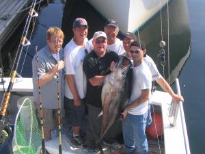 The weather man called for 10-15 Sou west on Sunday,however it blew and rained alot more than reported but my hardy charter group of Jeff Stone and company from the Boston area had a charter to rember.The wind picked up and blew hard but these guys got through the tough conditions and hooked a nice 100 lb. plus bluefin on a Penn 50 with a stand- up rod.The fish poundered the right rigger suid rig and took lots of line,the blinding rain and strong winds made it differcult to fight the fish but our guys hung in there and about 30 mins. later had a nice fat tuna on board.The bank had but a few boats that day and the fish where in there just waiting for the fishermen that would brave the harsh conditions.The Northwest corner or Stellwagon has been alive with bait,whales,sshool tuna.Give it a try or call Capt, Mike about a charter.