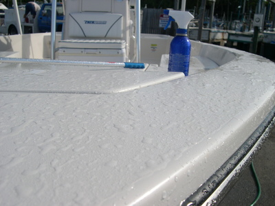 I can't say enough great things about Woody Wax products. Late Sunday I applied my second application of Woody Wax non skip deck wax. Its amazes me how easy this is to apply and how truly outstanding it works. Its mackerel and king mackerel season which means blood and baits parts will be all over the boat. Clean up has never been easier nor has the deck ever been so tacky and not slippery. Take your deck brush spray a small amount of non skid deck wax on the brush then brush it in, rinse and you are done. Results are immediate as you will see the water bead up.