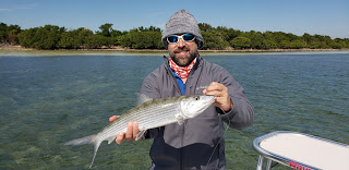 Burr, it's been cold with night time lows in the 40's and by Miami standards that's really cold. That was not an issue for Kent and Alex from Texas as they jumped aboard bundled up and off we went. Hitting a few tarpon spots that should have held fish was a swing and a miss. More concerning was that the schools we did find were hunkered down on the bottom, a sure sign they are stressed. A quick glance at the Raymarine told the story, cold water temperatures, in the mid 60's. Ouch! We moved on and caught a few mackerel, lady fish, snappers and jacks but it was definitely slow. Running south at the right tide for bonefish I was concerned but optimistic about the warmer water flushing in with the incoming tide. This is when Kent got a nice bonefish and missed another bite but it was not what it should've been. To add to the troubles, there were no pelicans diving on bait schools and not bait to be found, no surprise as by now the water temps were between 63 and 65 degrees. The day ended on a flat with the incoming tide for sharks but that also drew a blank. So, it was slow, we caught fish and Kent got a nice bonefish. Hmmm, I'm not quite certain how this day turned out.