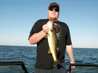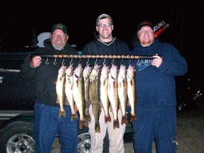 It was a short 5 hr. trip with Matt, Tim and Mickey from lower Michigan. We got on the water around 5 p.m. and started trolling Walleyes Choice harnesses in 20 to 24 feet of water over some rock piles and almost immediately got into the fish. We used both in-line weights on boards and bottom bouncers over the side of the boat and both methods worked. On our first short pass over the structure we had 4 nice fish in the first 20 minutes. I would have to say that I-51 was by far the best color, but we also caught a few on C-5. All nice quality fish yesterday. We did pick up a few on crankbaits once the sun went down. We had time to try a couple of night spots before our time was up and we caught fish at each location. I thought the fish would have been on fire with the way the wind was blowing, but they were actually kind of sluggish where we fished. Here's some pictures of our trip and video of the catch.